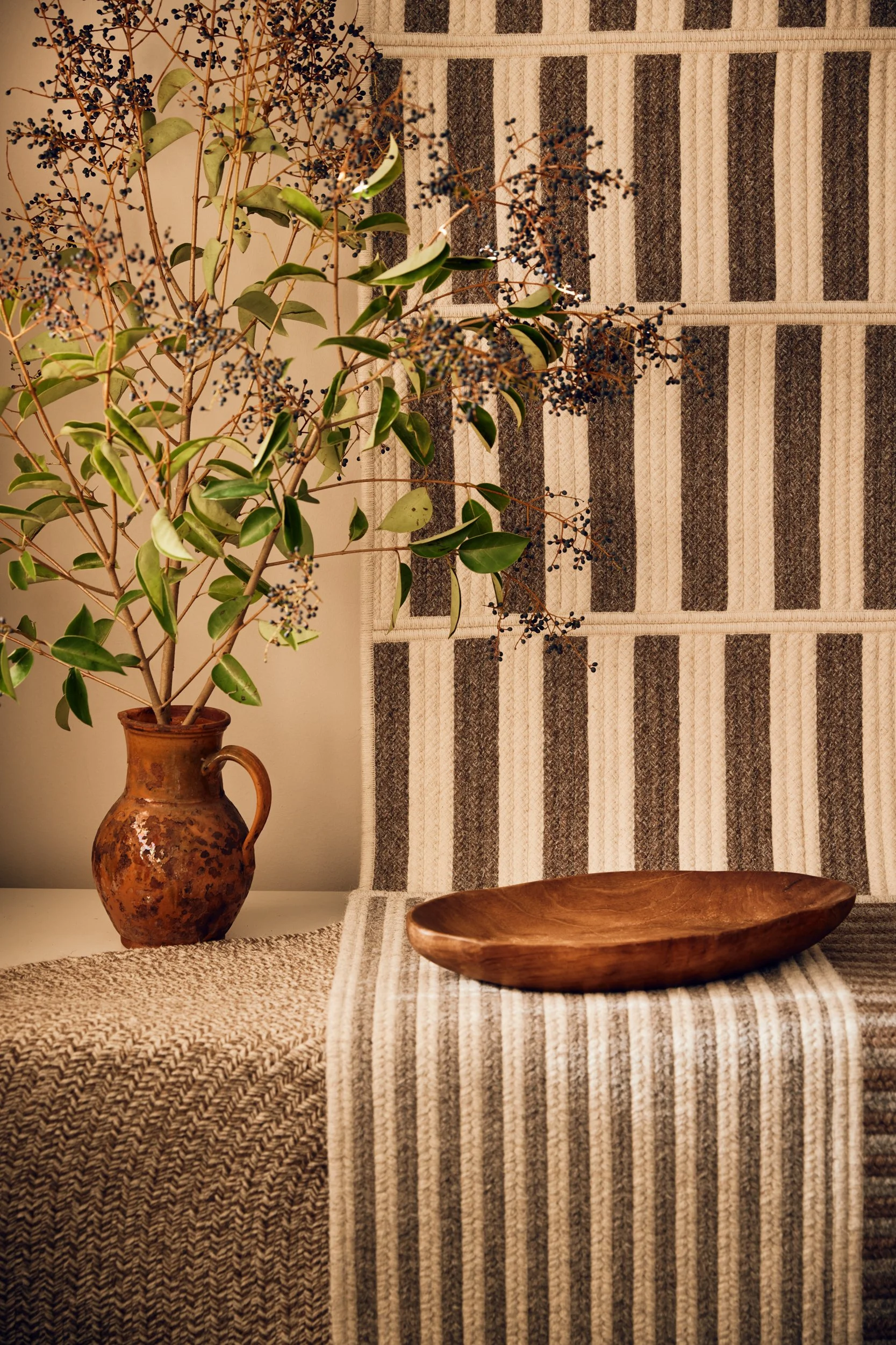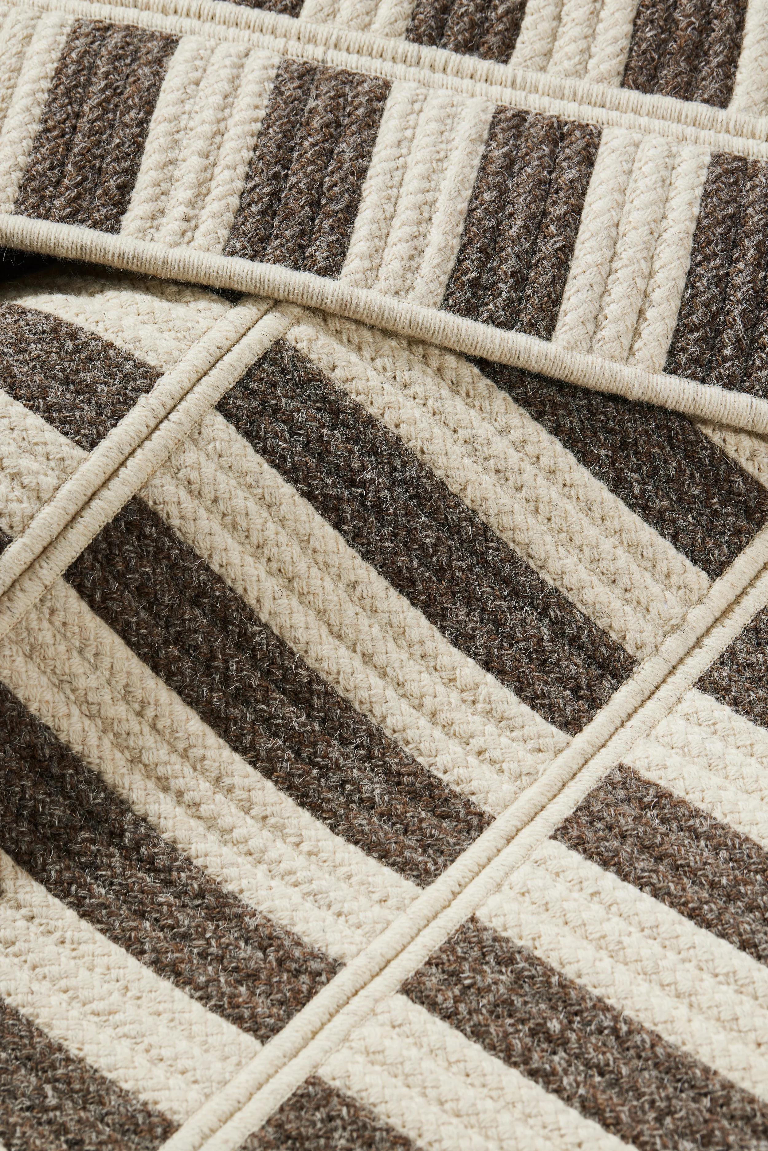 Rich wool tones are artfully interwoven into a tweed of thick, cable-woven braids, resulting in a bold and sophisticated composition reminiscent of a brick-like pattern.