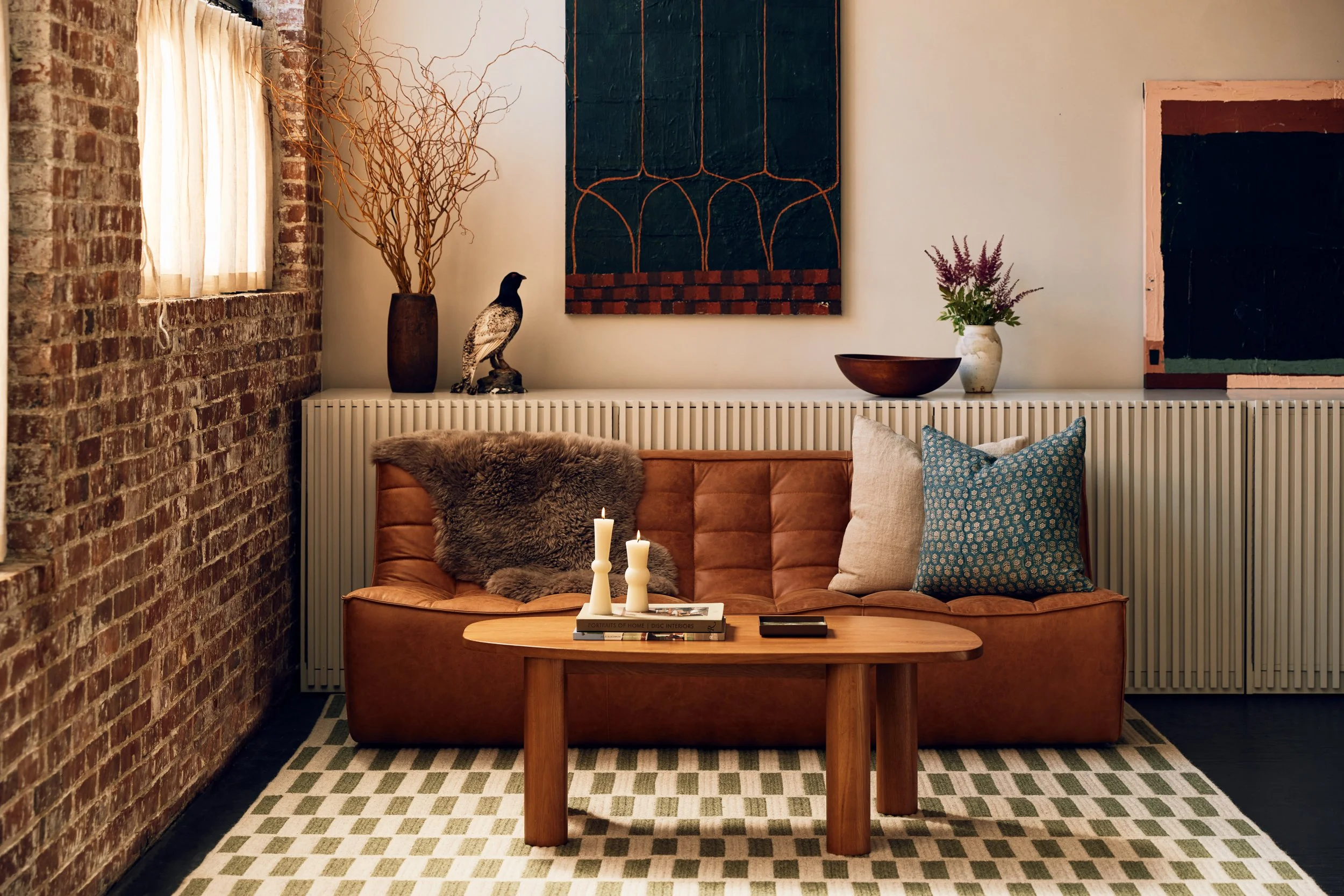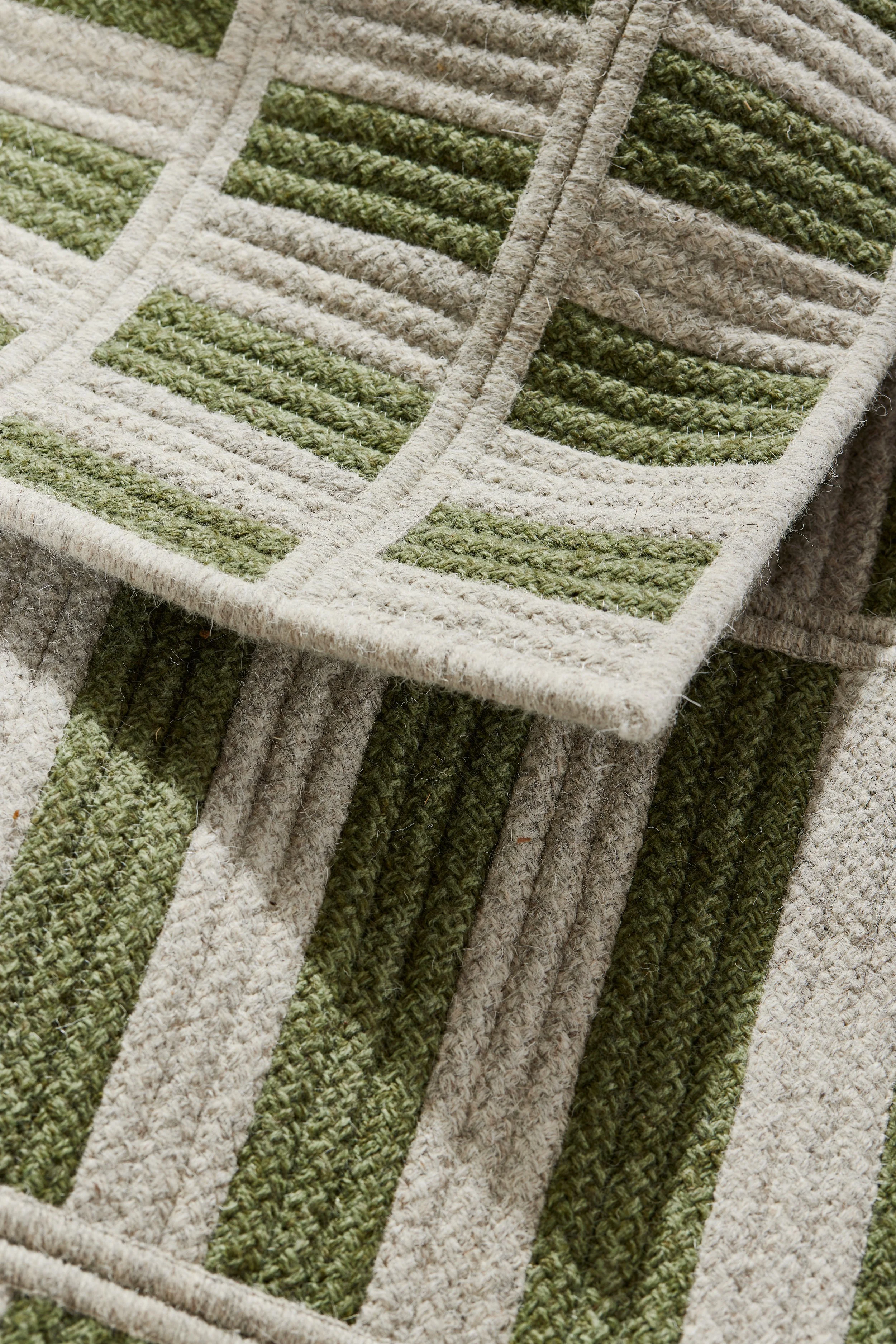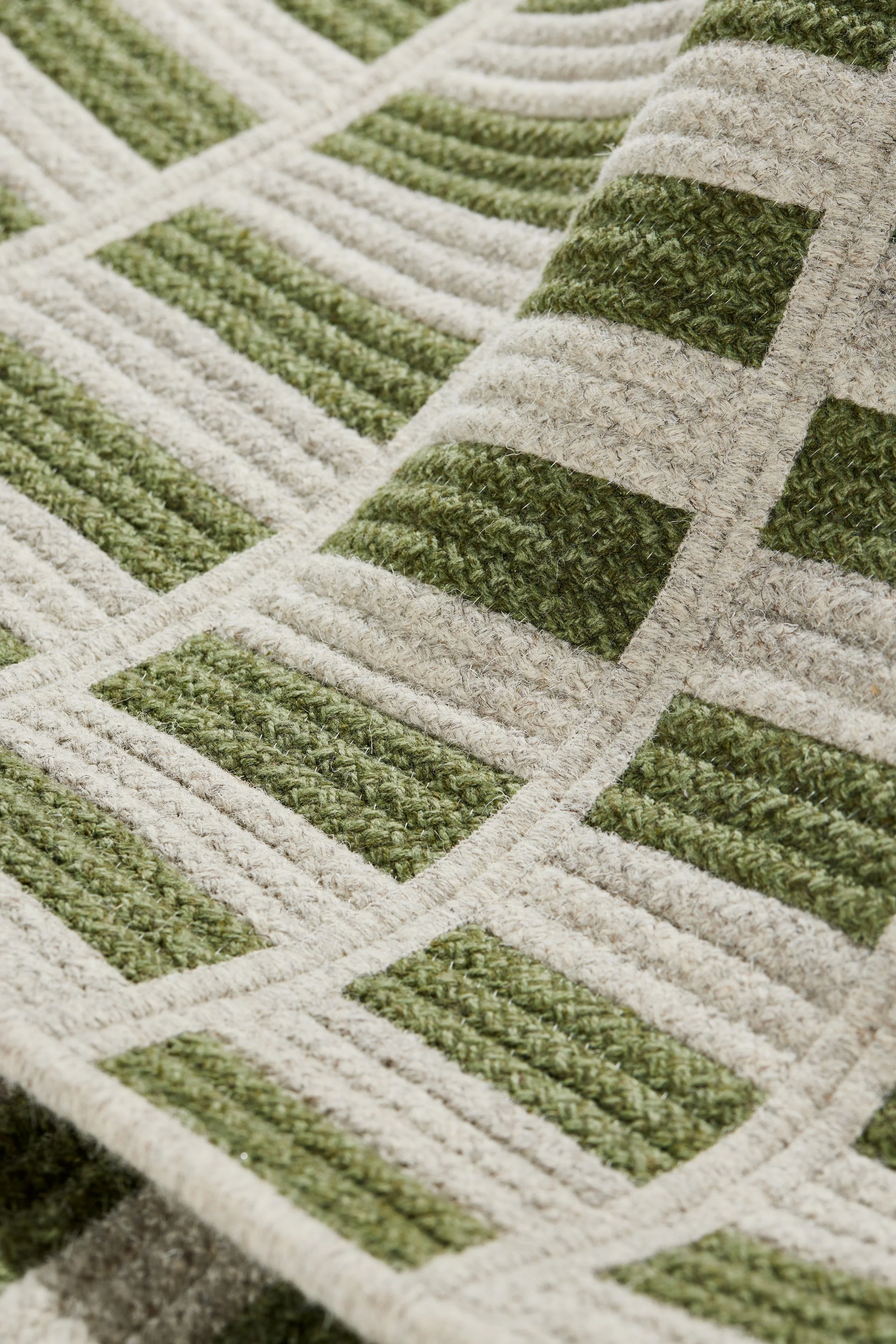 Rich wool tones are artfully interwoven into a tweed of thick, cable-woven braids, resulting in a bold and sophisticated composition reminiscent of a brick-like pattern.